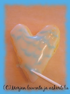 Tässä hieman tilanne kuvia tuosta marmoroinnista. Eli ensin laitetaan valkoinen kuorrutus (valkuaista ja tomusokeria). Sen jälkeen heti perään värillisellä kuorrutuksella viivoja ja samantien ennenkuin ehtii kovettua vedetään tikulla marmorointi.. Aikaa vievää puuhaa, mutta nättejä tulee.